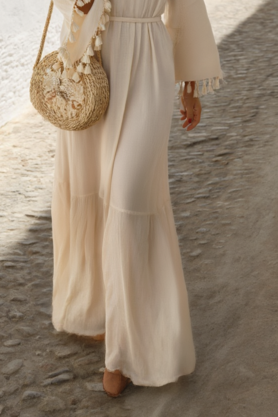 Effortlessly chic, this Bohemian Dress in soft beige features a flattering V-neckline and flowy floor-length silhouette for a romantic, free-spirited look. The delicate tassel details add movement and boho charm, while the lightweight fabric ensures comfort. Perfect for festivals, beach weddings, or summer gatherings, this dress exudes carefree elegance. Style with sandals and layered jewelry for a dreamy bohemian vibe.