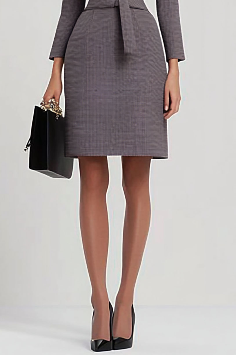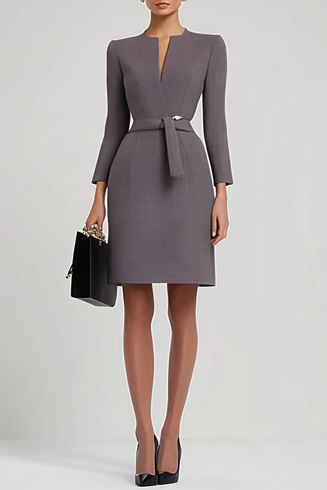 Elevate your wardrobe with this elegant grey sheath dress, perfect for professional and formal occasions. Crafted from a premium, textured fabric blend, it offers a tailored fit that flatters every silhouette. Featuring a sleek slit V-neckline, three-quarter sleeves, and a knee-length hem, this dress exudes timeless sophistication. The cinched waist with a fabric belt, accented by a minimalist metallic detail, adds a refined touch. Ideal for business meetings, corporate events, or upscale daytime gatherings, this versatile piece transitions effortlessly from office to evening. Pair it with classic pumps and a structured handbag for a polished, confident look that never goes out of style.
