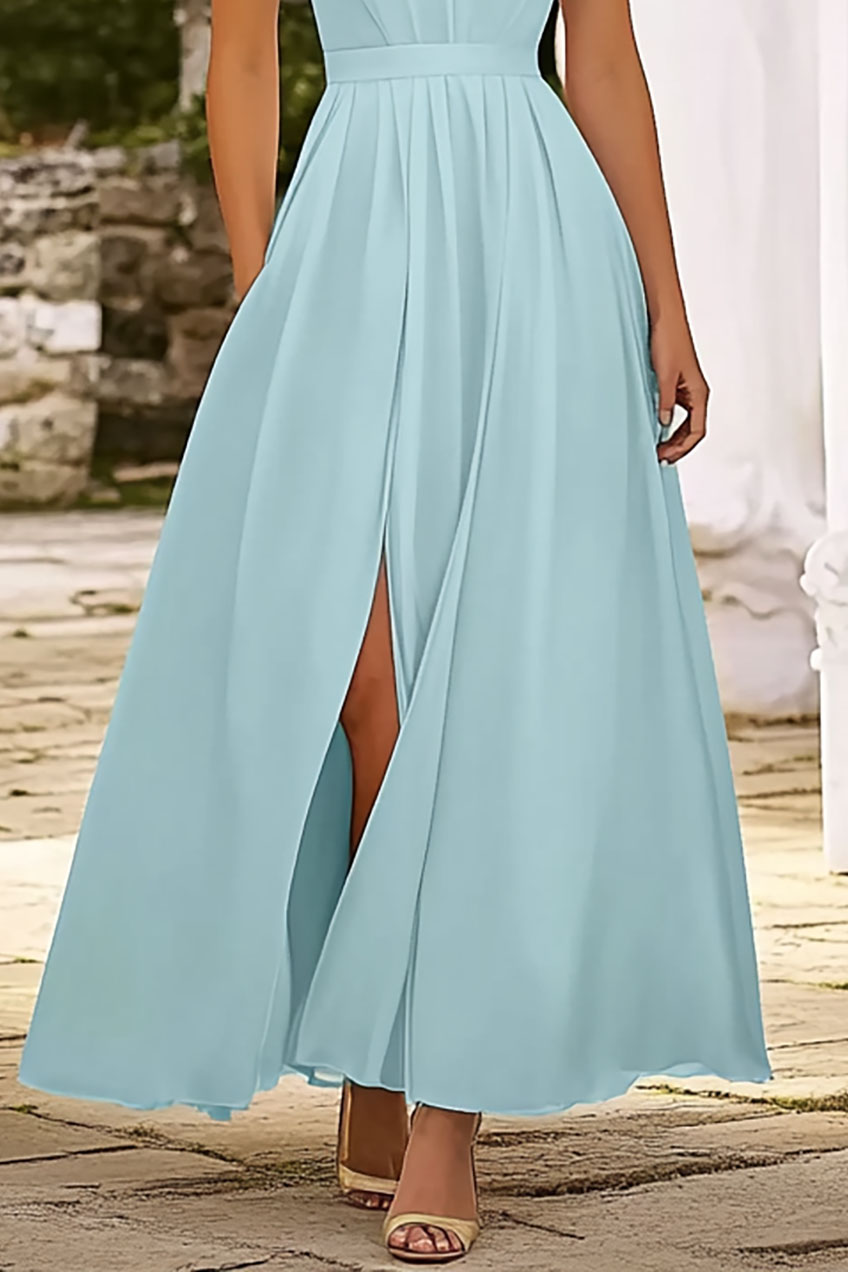 Vacation Dress Blue Deep V-Neck Sleeveless High Slit Maxi Dress