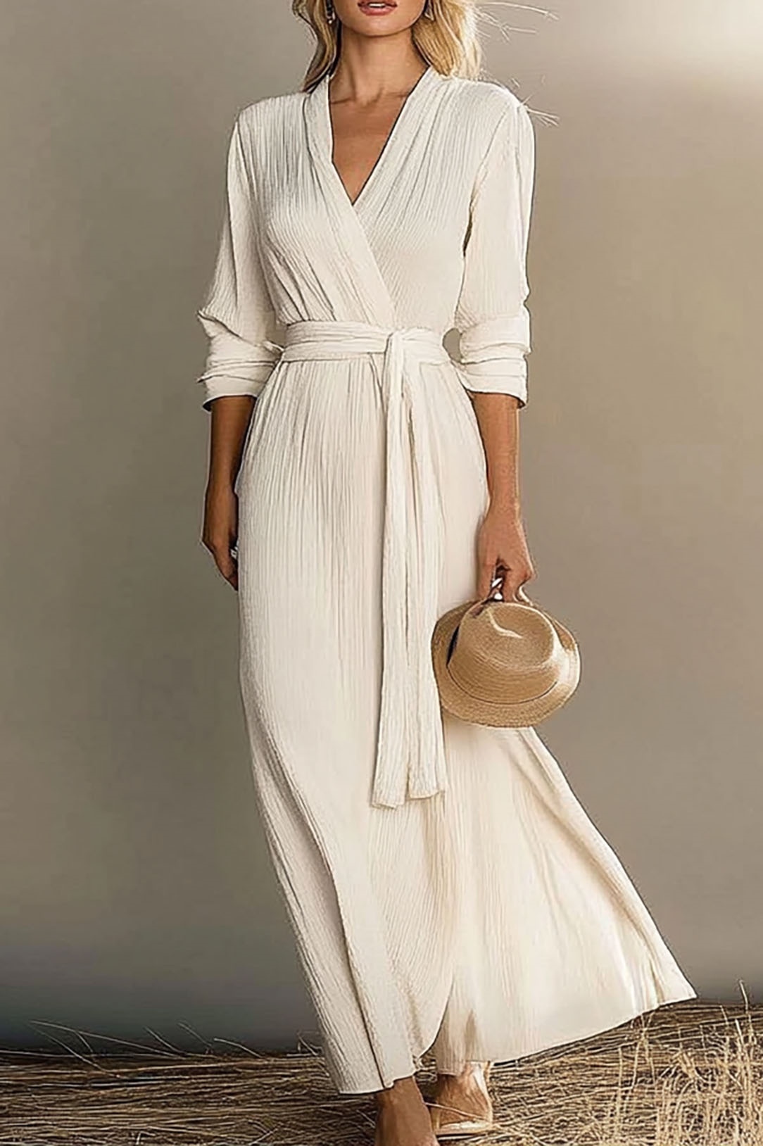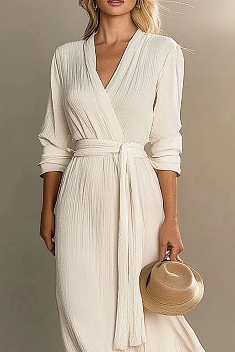 This white linen dress features a cross-over design and a tie waist, offering a flattering silhouette. The long sleeves provide added comfort, making it a perfect piece for vacation or casual days. The lightweight fabric keeps you cool and stylish all day long.
