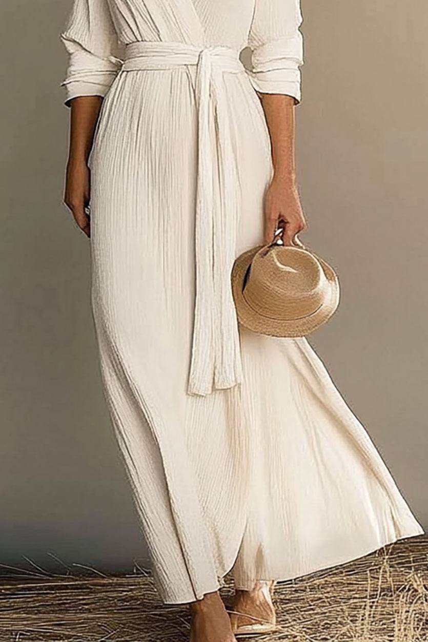 Casual Vacation Linen Dress White Long Sleeve Tie Waist Maxi Dress