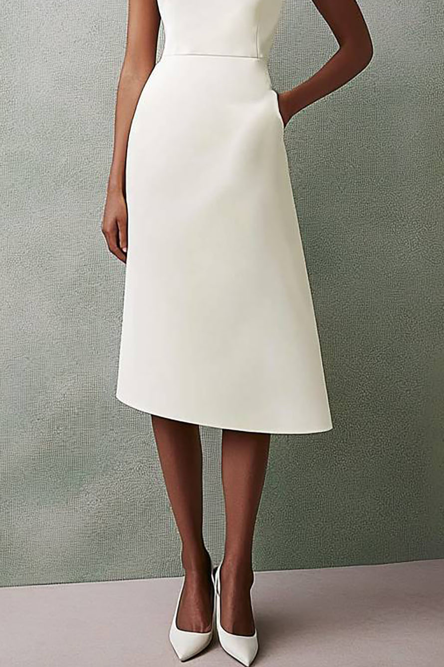 This white work dress offers a sophisticated look with its sleeveless crew neck and unique asymmetrical hem. Designed with convenient pockets and a flattering midi length, it balances functionality and style for your office and business events. Crafted from comfortable fabric, this dress ensures ease of movement and all-day wearability. Pair it with a blazer for a polished corporate outfit or wear alone for a chic office look.