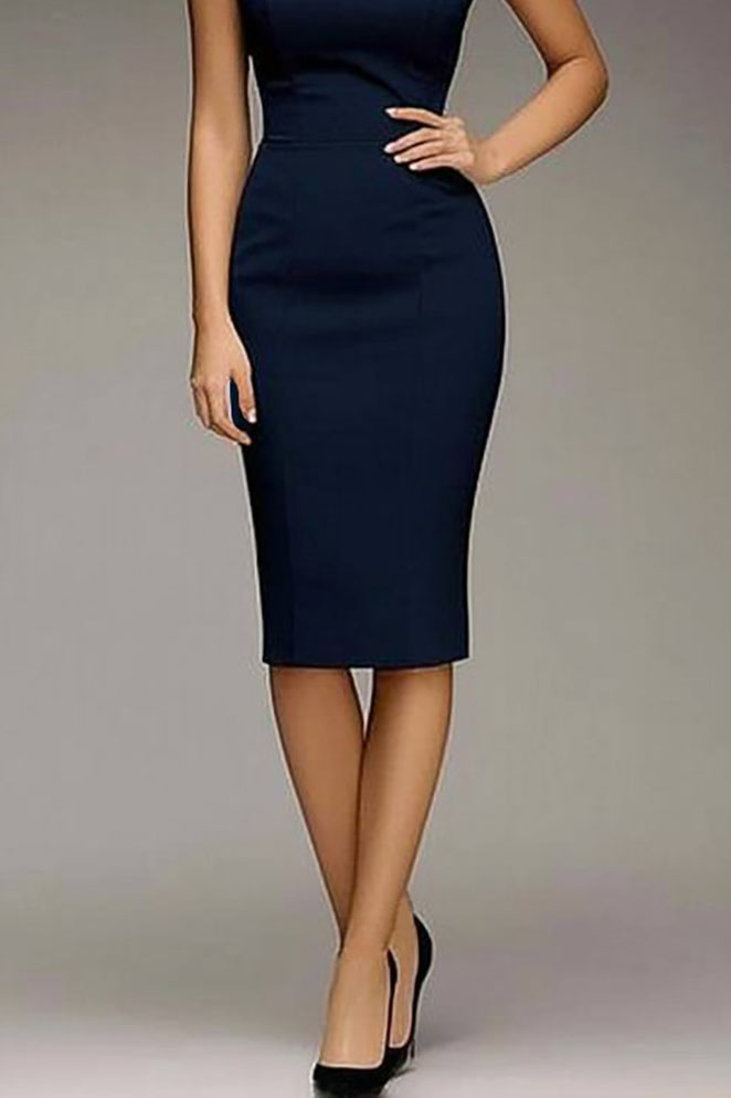 This navy work semi formal dress offers a chic asymmetrical neckline combined with a flattering fitted silhouette. The knee length cut provides a polished and professional appearance suitable for office events, business meetings, and formal occasions. Made with comfortable fabric, it ensures ease of movement and style throughout the day. Pair with heels or a blazer for a refined office outfit.
