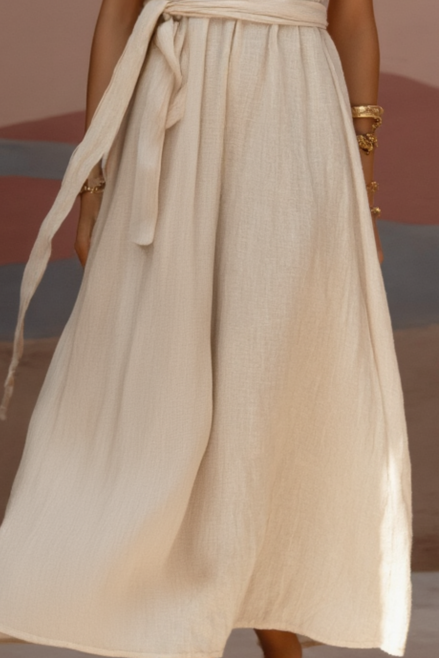 Bohemian Dress Beige Square Neck Waist Tie Maxi Dress
