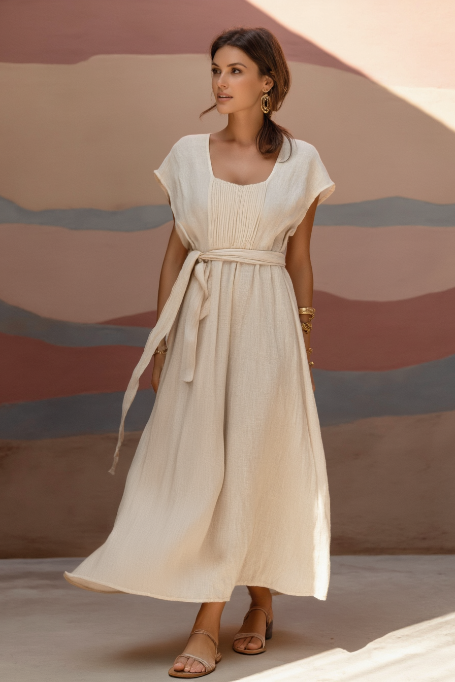 Channel effortless boho elegance in this dreamy Beige Square Neck Maxi Dress, featuring a flattering waist tie that accentuates your silhouette. The timeless neutral hue and flowy fabric create a romantic, free-spirited vibe, perfect for beach weddings or summer outings. This versatile dress blends comfort with sophisticated bohemian charm for unforgettable warm-weather moments.