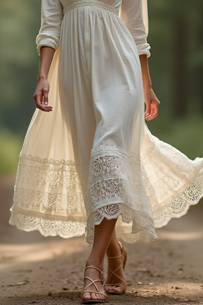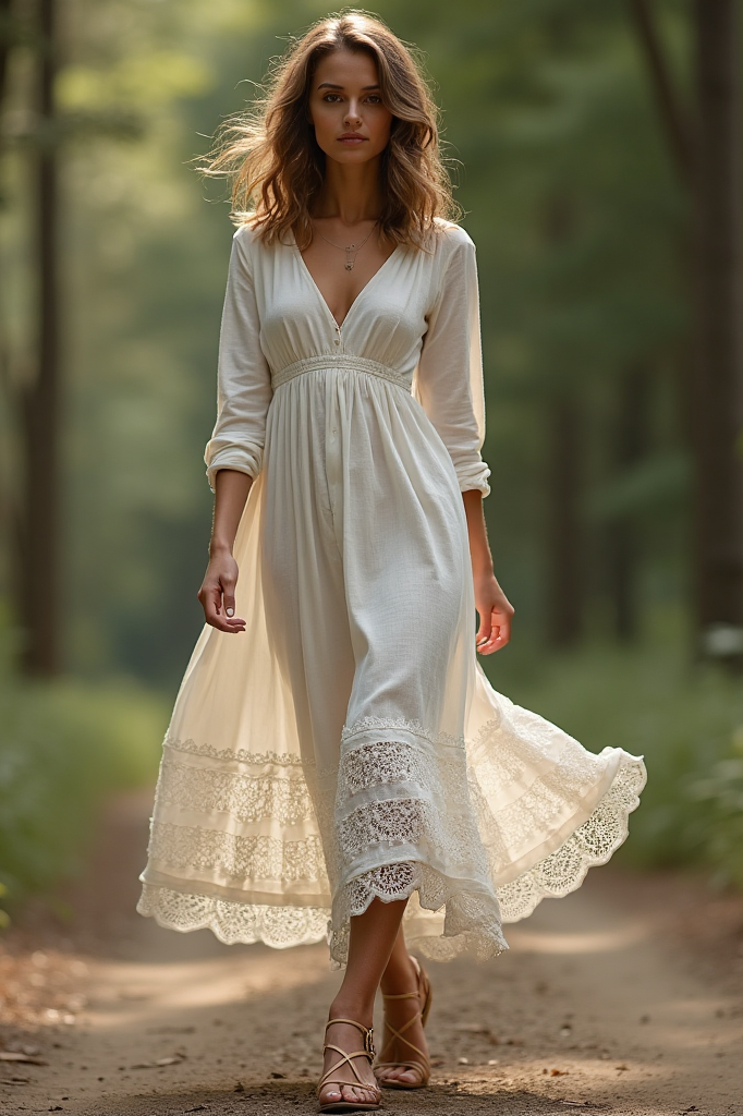 Radiate ethereal beauty in this romantic white maxi dress featuring a delicate V-neckline and intricate lace detailing. The flowing floor-length silhouette sways gracefully with every step, perfect for garden parties or beach weddings. Lightweight and breathable, this boho-chic design pairs beautifully with floral crowns and gladiator sandals for a whimsical, feminine look.