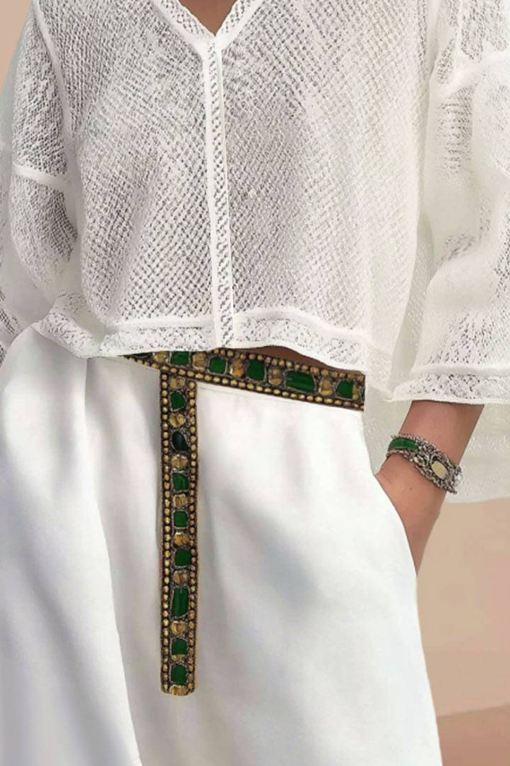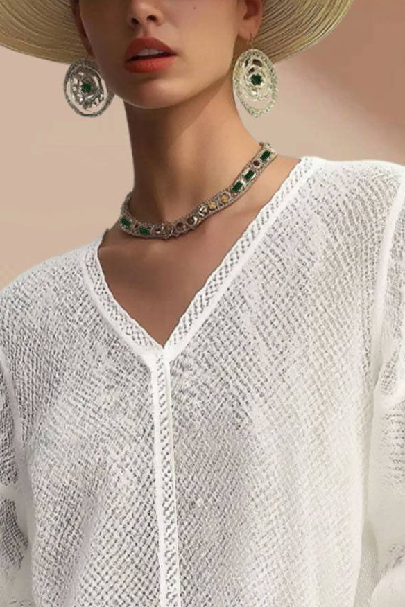 This white V-neck top is made from breathable fabric, offering a relaxed, bohemian vibe with its long sleeves and short cut. Perfect for a vacation or casual day out, the lightweight material keeps you comfortable while the simple design pairs well with skirts, shorts, or jeans.