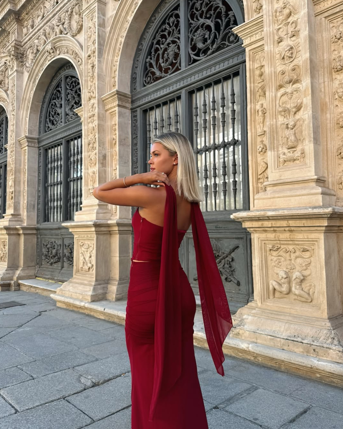 Our 'Malu' maxi is a modern take on a classic mesh silhouette, reimagined as a two-piece set: a corset and a maxi skirt. Designed to be worn together and sold as one, it beautifully enhances every curve. Crafted from soft stretch mesh, the set pairs the fluidity of a gathered skirt with the structured, romantic touch of the corset. The mid-rise skirt features a concealed side zip, creating an elegant and timeless look.