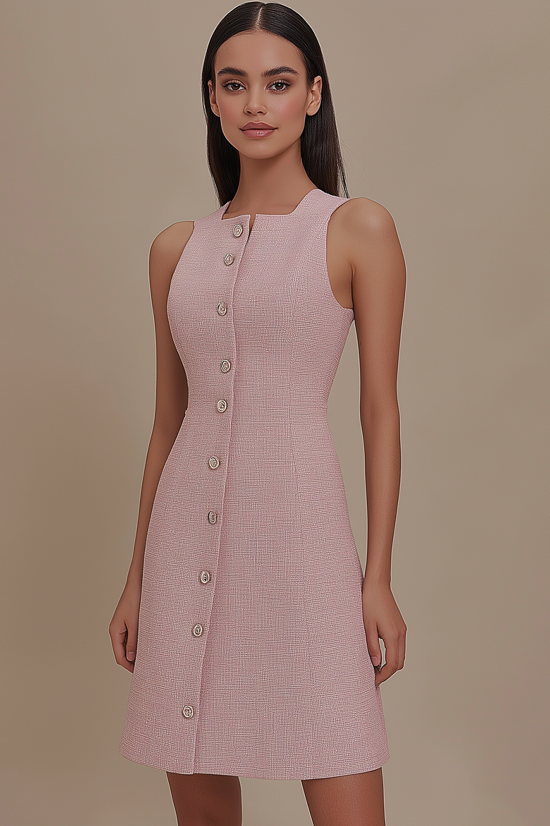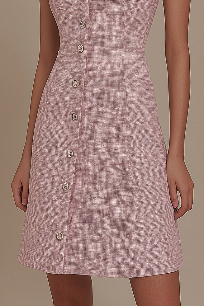 Work Dress Pink Tweed Button Square Neck Sleeveless Mini Dress