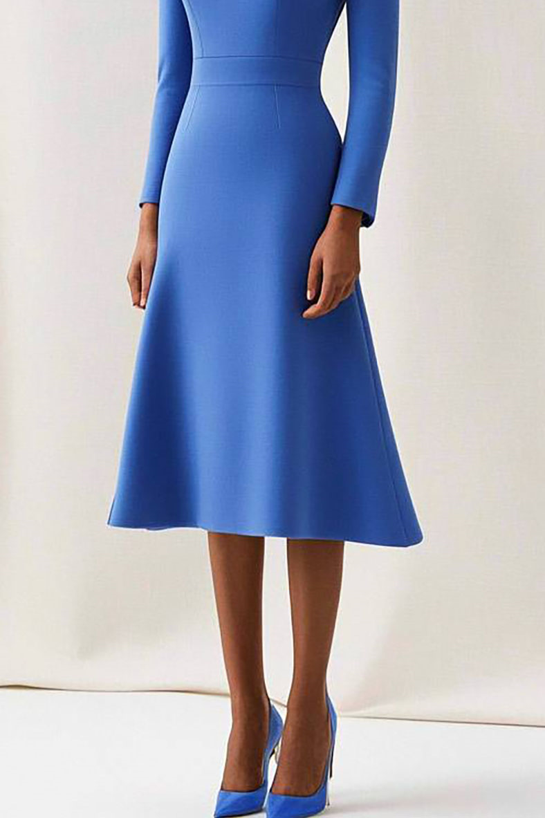 Work Dress Blue Crew Neck A-Line Long Sleeve Midi Dress