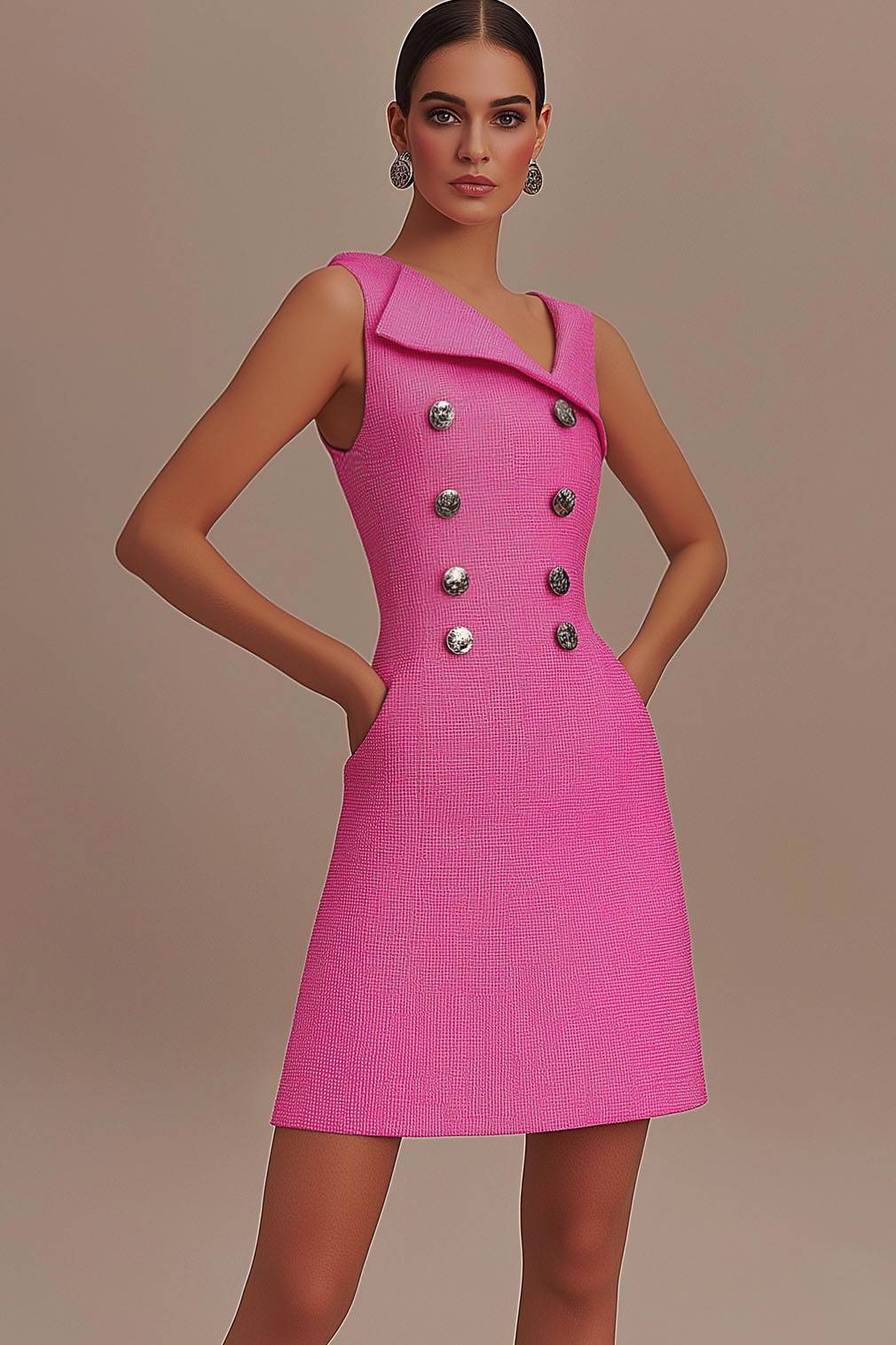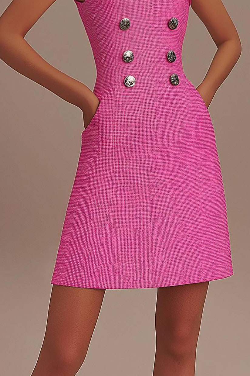 This pink work dress offers a unique blend of style and practicality with its sleeveless cut, double breasted button detail, and asymmetrical neckline. The mini length and pockets provide convenience and a youthful, professional look ideal for office wear and casual business events. Crafted from comfortable fabric, it ensures all-day wearability without compromising elegance. Pair with heels or flats for a polished office outfit.