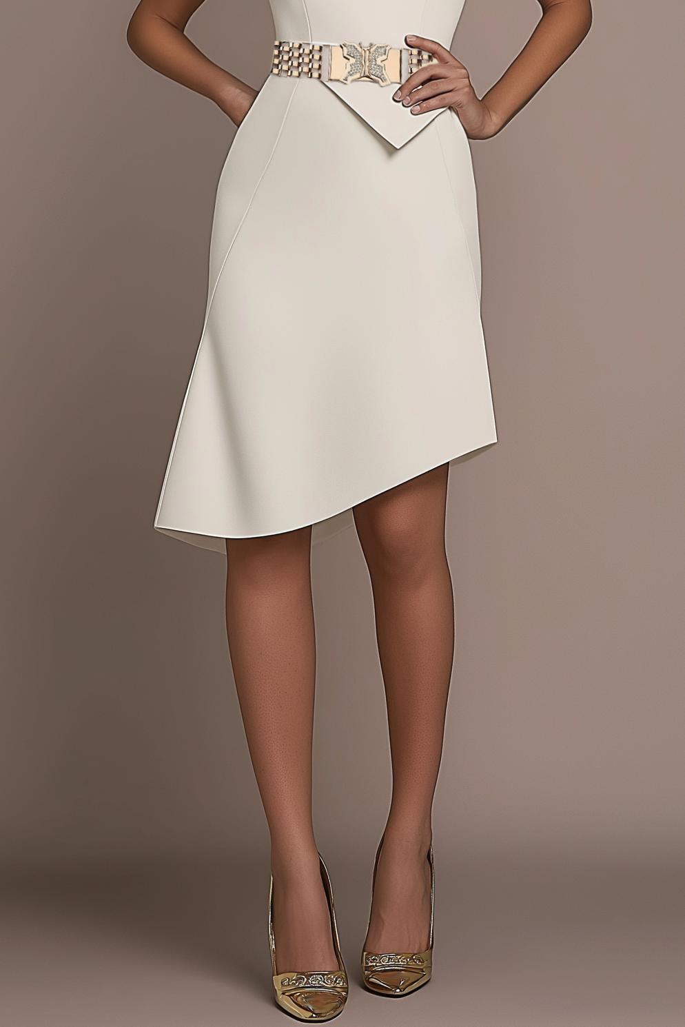 This white sleeveless belted work dress features a stylish asymmetric hem and knee length silhouette, offering a modern twist on classic office attire. The belted waist enhances your figure for a flattering fit.